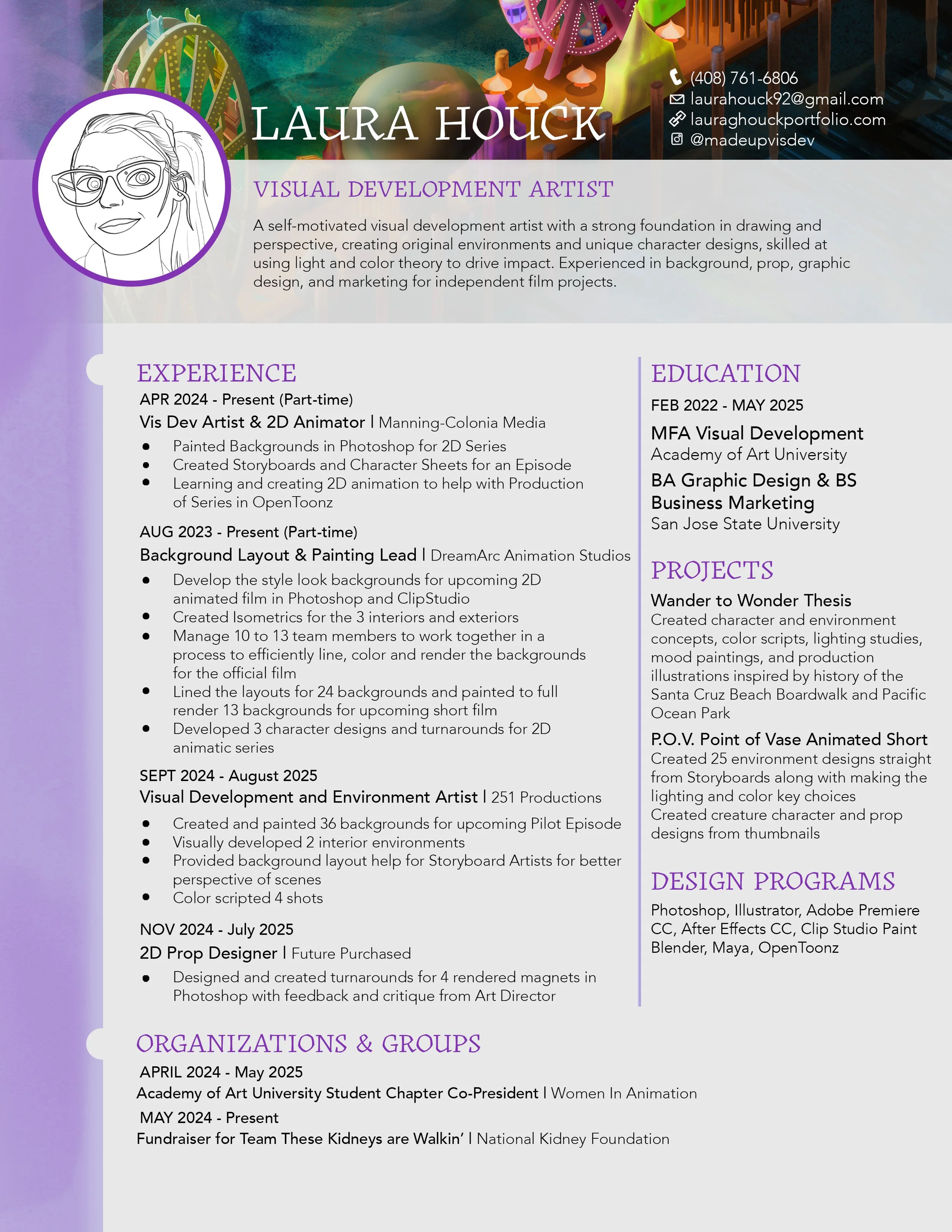 Since February 2022, I’ve been on my journey in attaining a Master's Degree in Visual Development, where I can create and design more in visual storytelling. My goal is to become a Visual Development and Storyboard artist for Animated features and series. During my program I have been working on my Thesis Project to create the visual development for my 2D animated feature called, “Unwandered Kindred”. I have created multiple environments, characters, props and cinematic moments for this visual story that are in my portfolio now. As well, there is more to come, that I also need to upload from in Photoshop, and will be continuing to update it.